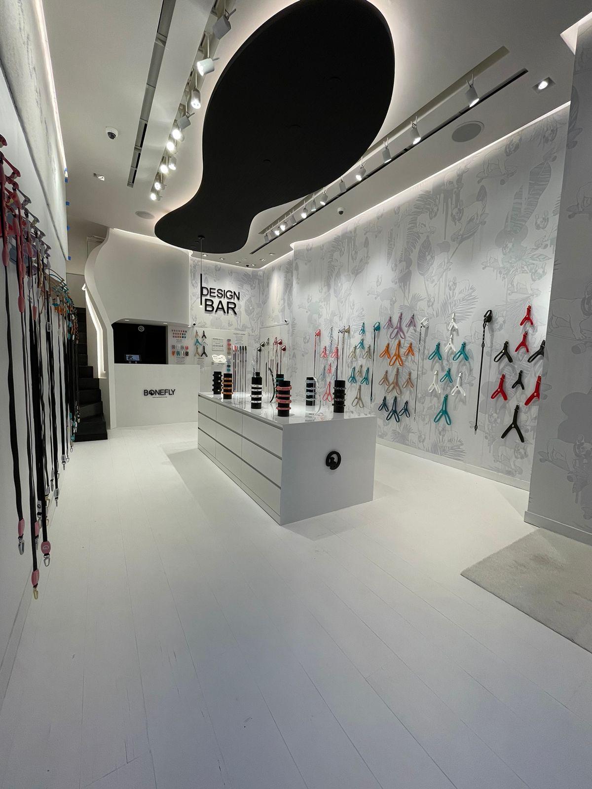 The Bonefly store is a modern, luxury pet-lifestyle boutique—clean, bright, and curated like a high-end fashion space. Premium silicone accessories, customization experience, and crystal details are showcased in a minimalistic setting, creating an elevated, shopping experience that celebrates style, comfort, and the bond between you and your dog.
